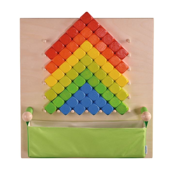 This Dice Sensory Wall Activity Panel has six colors of dice that can be stacked between wooden dowels to make patterns and constructions.